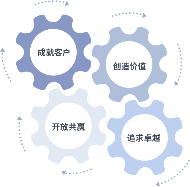 成就客户是一切决策的出发点,,,创造价值是衡量所有工作的标准,,,追求卓越是我们做事做人的态度,,开放共赢是我们的格局也是最终的结果。。。价值观的齿轮环环相扣,,,,推动着组织里的每个人不断向前。。。。