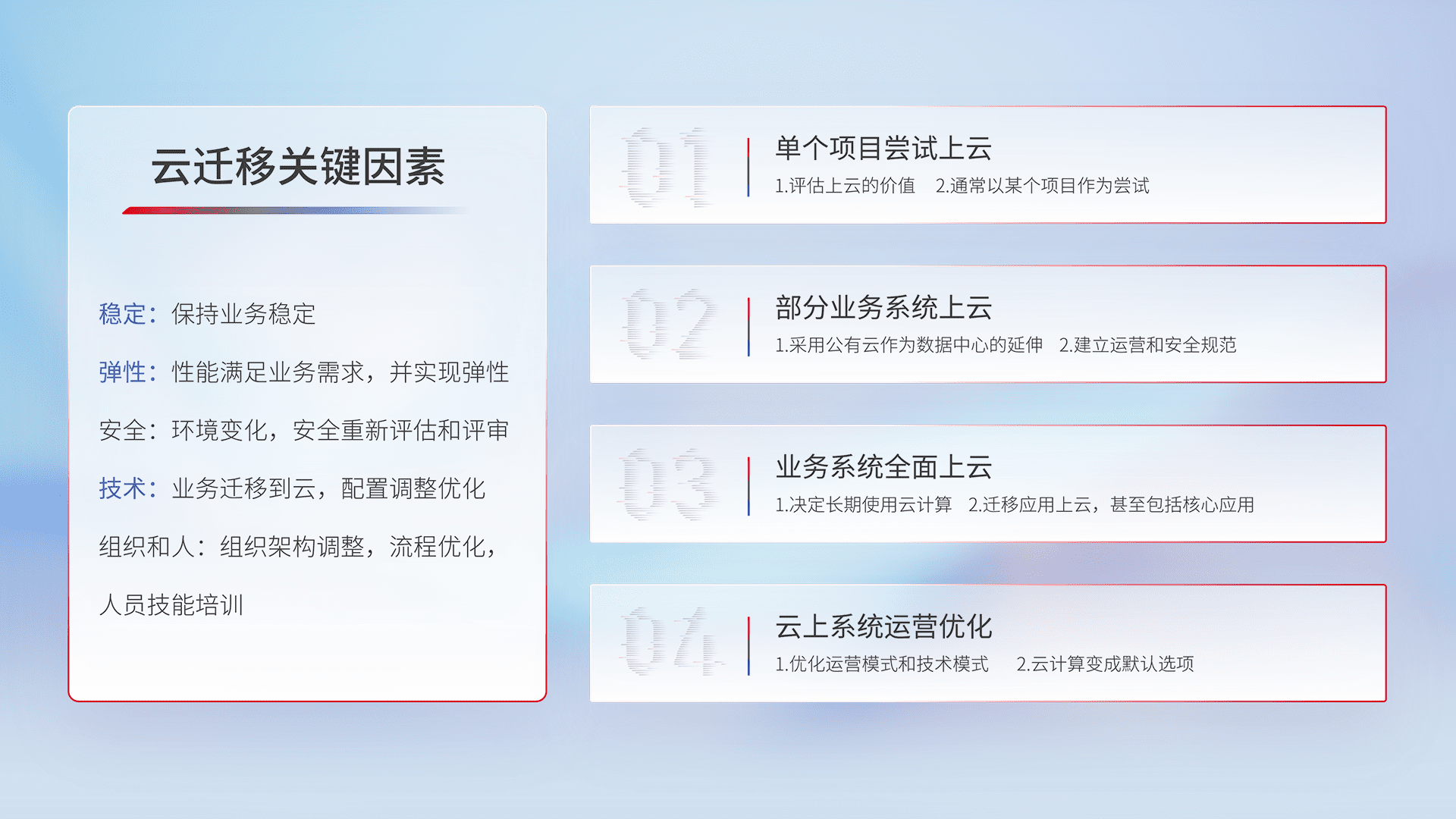 结合实际业务,,,,从规划设计、、云平台选型、、、、云原生改造、、、、数据迁移、、、集成交付,,,迁移全过程为客户识别最佳上云路径,,,,做好风险识别管理,,设计网络架构、、、、身份权限、、、安全审计合规、、操作审计、、、、日志审计、、、监控告警策略、、、、多站点容灾设计等,,,,对云上基础设施进行整体规划,,提升IT治理水平,,以满足弹性、、高可用、、、、高性能的需求。。