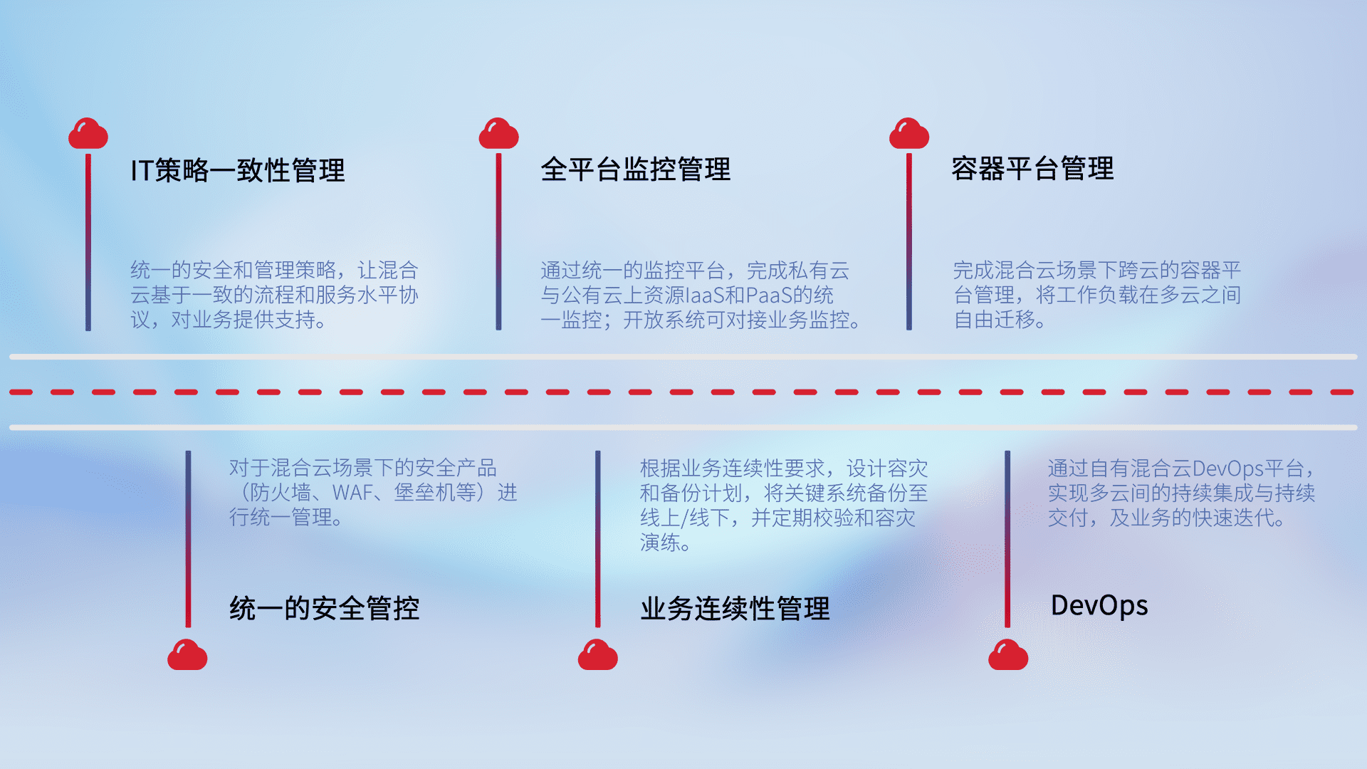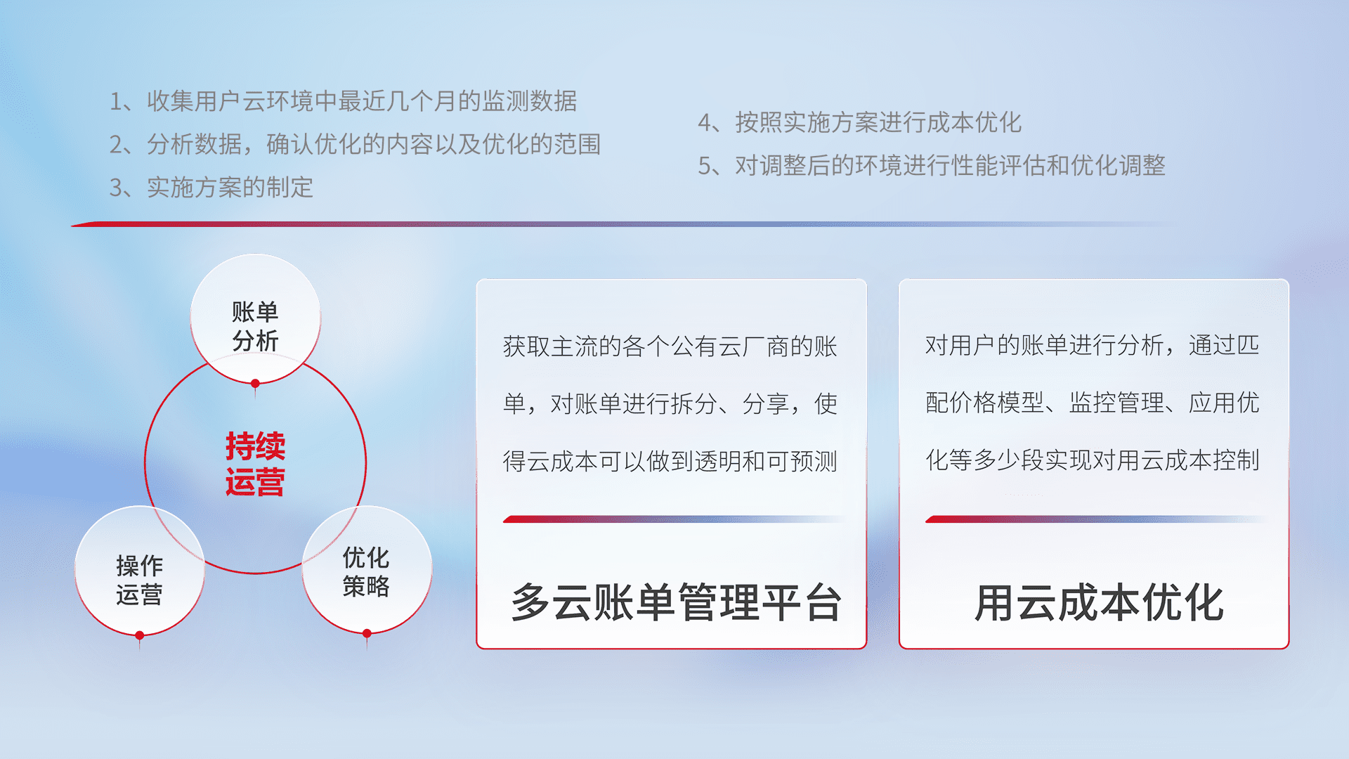 通过多云纳管,,,,以统一的资源数据模型把客户的云资源进行抽象和封装,,,,进而实现对多云资源的统一操作,,,保障云资源管理的可靠性、、、、稳定性与可用性。。。量身定制化运维内容,,,配置、、、、开发运维、、补丁管理、、备份、、、、监控、、、、认证和访问管理、、、审计和日常巡检等,,保障在用云过程中的可靠度,,稳定度以及高可用率。。。。